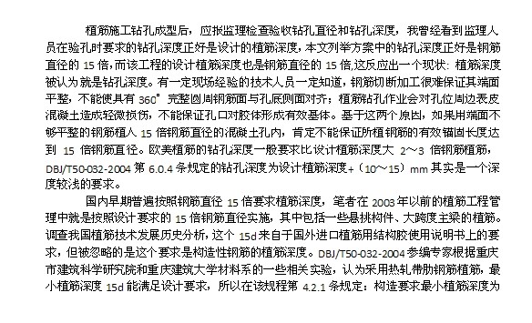 植筋施工鉆孔成型后,應(yīng)報(bào)監(jiān)理檢查驗(yàn)收鉆孔直徑和鉆孔深度,在驗(yàn)孔時(shí)要求的鉆孔深度正好是設(shè)計(jì)的植筋深度,鉆孔深度正好是鋼筋直徑的15倍,而該工程的設(shè)計(jì)植筋深度也是鋼筋直徑的15倍,這反應(yīng)出一個(gè)現(xiàn)狀:植筋深度被認(rèn)為就是鉆孔深度。有一定現(xiàn)場經(jīng)驗(yàn)的技術(shù)人員一定知道,鋼筋切斷加工很難保證其端面平整,不能使具有360°完整圓周鋼筋面與孔底側(cè)面對(duì)齊;植筋鉆孔作業(yè)會(huì)對(duì)孔位周邊表皮混凝土造成輕微損傷,不能保證孔口對(duì)膠體形成有效基體。基于這兩個(gè)原因,如果用端面不夠平整的鋼筋植入15倍鋼筋直徑的混凝土孔內(nèi),肯定不能保證所植鋼筋的有效錨固長度達(dá)到15倍鋼筋直徑。歐美植筋的鉆孔深度一般要求比設(shè)計(jì)植筋深度大2~3倍鋼筋植筋,DBJ/T50-032-2004第6.0.4條規(guī)定的鉆孔深度為設(shè)計(jì)植筋深度+(10~15)mm其實(shí)是一個(gè)深度較淺的要求。