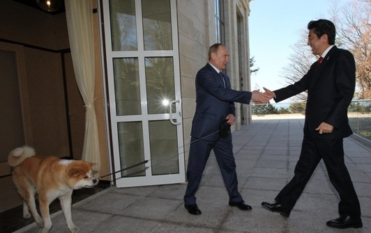 2012年7月訪俄時送給普京的禮物是一只秋田犬,名字意思是“夢”,送的時候3個月大,現在已快兩歲。普京在迎接安倍時專門帶上它同安倍重會。俄羅斯媒體報道,見到Yume后,安倍用俄語說了一句“好狗”,普京回答說:“但它有時候也咬人。” 網友周龍然說 用狗迎接安倍真的恰當不過【普京牽著寵物狗會見安倍】 謝鑫少年本格推理 牽著狗……好吧,老普你贏了……【普京牽著寵物狗會見安倍】