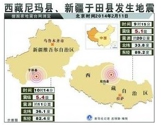 北京時(shí)間2月11日9時(shí)15分,在西藏自治區(qū)那曲地區(qū)尼瑪縣(北緯33.8度,東經(jīng)89.2度)發(fā)生5.1級(jí)地震,震源深度20公里。