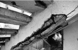 由于混凝土質量較差或保護層厚度不足,混凝土保護層受二氧化碳侵蝕炭化至鋼筋表面,使鋼筋周圍混凝土堿度降低,或由于氯化物介入,鋼筋周圍氯離子含量較高,均可引起鋼筋表面氧化膜破壞,鋼筋中鐵離子與侵入到混凝土中的氧氣和水分發生銹蝕反應,其銹蝕物氫氧化鐵體積比原來增長約2~4倍,從而對周圍混凝土產生膨脹應力,導致保護層混凝土開裂、剝離,沿鋼筋縱向產生裂縫,并有銹跡滲到混凝土表面。由于銹蝕,使得鋼筋有效斷面面積減小,鋼筋與混凝土握裹力削弱,結構承載力下降,并將誘發其它形式的裂縫,加劇鋼筋銹蝕,導致結構破壞。