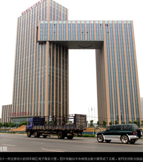 前10名最經典丑建筑說起鄭州電子商務大廈,很多人還比較陌生。網友CC:鄭州電子商務大廈和央視大樓有些神似,可以說是“大褲衩”的小弟弟或小妹妹,也可以說是“小褲衩”,沒有不敬的意思哈。網友雄鷹:看到這個樓就能想起央視“大褲衩”,是“樓像像”啊。