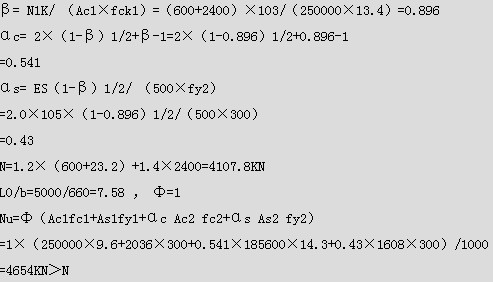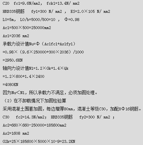 如:某中心受壓柱,高H=5 m,截面5 0 0m m×5 0 0m m,原結構混凝土強度設計等級C 4 0,共配8Ф1 8,承受軸向荷載標準值恒載G k=6 0 0KN,活載Q k=2 40 0KN,由于施工質量問題,經檢測結構檢測柱混凝土強度等級為 C2 0,要求對該柱進行加固。