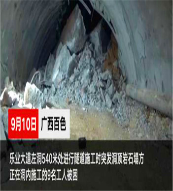 百色金固建筑結(jié)構(gòu)加固工程公司:9月10日18時許,百色市樂業(yè)縣樂業(yè)大道左洞540米處進行隧道施工時,突發(fā)洞頂巖石塌方,造成正在洞內(nèi)施工的9名工人被困。